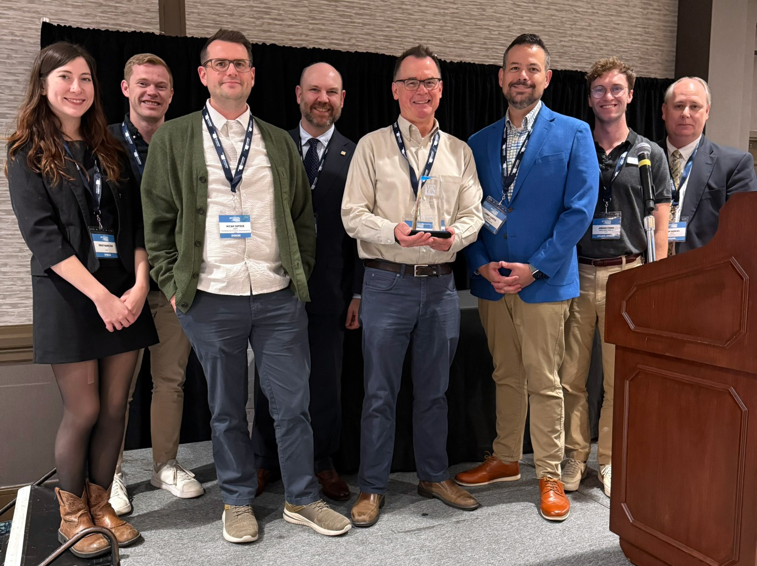 From left to right: Emily Hamilton (Halff), Shane Hampton (Hampton Planning and Design), Micah Snyder (former City of Bartlesville), Jim Eldridge (APA Oklahoma Chapter President), Greg Collins (City of Bartlesville), Larry Curtis (City of Bartlesville), Jordan Evans (Halff) and Ryan Harkins (APA Oklahoma Awards Committee Chair)